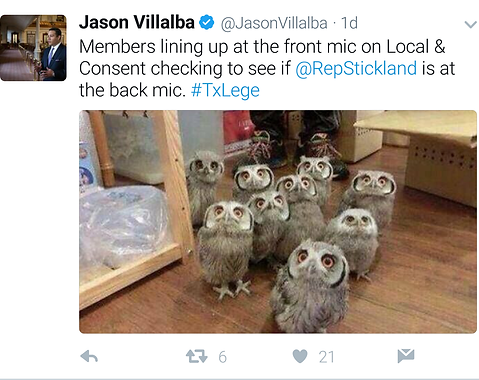 Tuesday, the House had 161 bills on L&C. Rep. Jonathan Stickland stood at the back microphone virtually the entire time – 4 hours – and terrified members who feared he might be standing there to kill their bills.