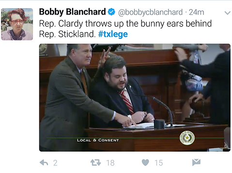 At one point, Rep. Travis Clardy laid out HB 1369 and refused to yield time for a question from Stickland. The Speaker then told Stickland, procedurally, he could either come to the front microphone and speak for 10 minutes against the bill, or he could stand down and let it pass.